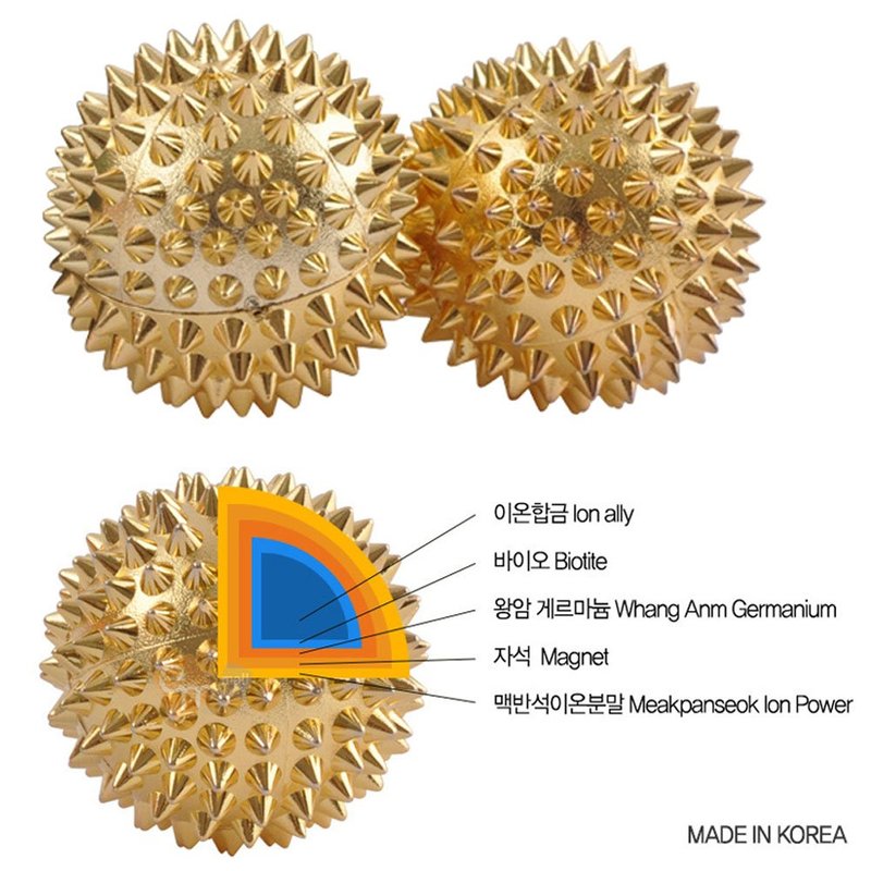Product name: Acupressure Spiky Magnetic Massage Balls For Health Care, Stimulates Blood Circulation / Health Improvement, Hand & Feet Fatigue Recovery / Stimulate nerves and reflexes, Combines acupressure massage and magnetic therapy, Made In Korea, Size: 35mm (D), Material: ABS, Magnet, Color : Gold, Contents: Hand Acupressure Spiky Balls (2 pcs), Pouch, Case, Simple manual, Effective for relieving fatigue, Your handy instrument for health care, Massage the acupoint of palms, Based on traditional Oriental acupressure therapy, Promote health and circulation, Combines acupressure massage and magnetic therapy, Use with hands or feet, Stimulate nerves and reflexes, 35mm (D) diameter balls.