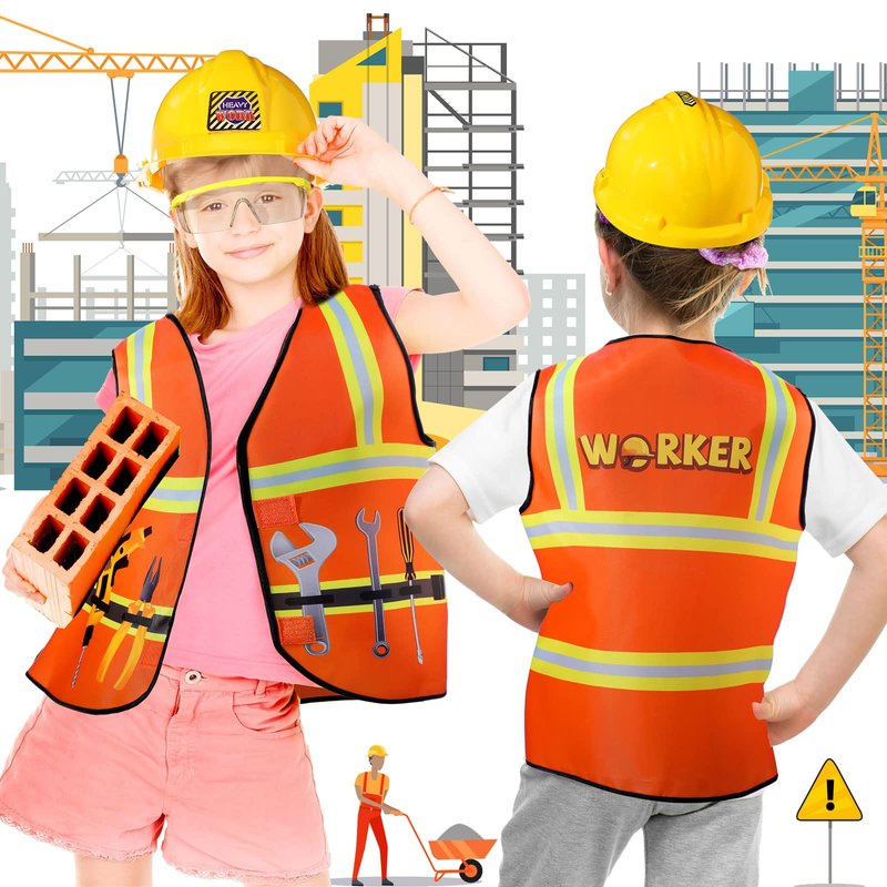 - Construction Themed Design: there's Work to Do! Break out the blueprints and head to the construction site in this Construction Worker costume. Boys and girls can pretend play and dress up for the imaginative job with these orange construction vests and yellow hard hats and goggles. They must be very excited