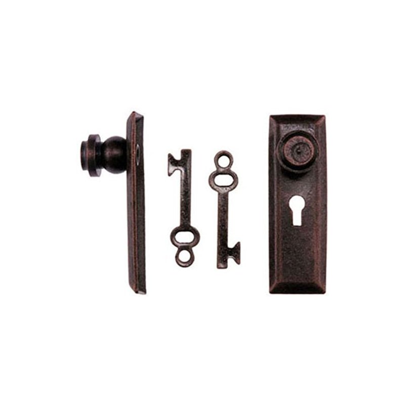 Oil Rubbed Bronze Finish Door Knob w/Key Plate. By Classics of Handley House. Designed for the 1:12 scale setting. Made of metal. Plate and handle measures 3/4 inches tall 1/4 inch wide x 1/4 inch deep. There is 1 complete doorknob in each pack 2 pieces shown - one for the front and one for the back of the door.
