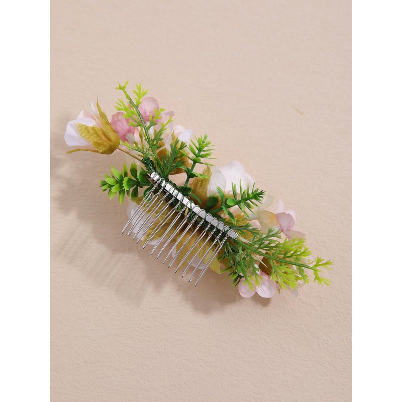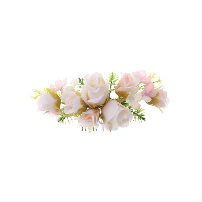 Elevate your bridal look with this exquisite floral hair comb, meticulously handcrafted with delicate silk roses and verdant greenery accents. The soft, blush-hued roses and lush foliage create a romantic, ethereal aesthetic that will complement your wedding day ensemble. Crafted with care and attention to detail, this hair accessory boasts a sturdy metal comb that securely holds your tresses in place throughout the festivities. Whether worn as a stunning centerpiece or paired with a veil, this floral hair comb adds a touch of timeless elegance to your bridal style. Measuring approximately 6 inches in length, it effortlessly blends with various hairstyles, from elegant updos to cascading curls. Embrace the beauty of nature and let this enchanting hair accessory be the crowning glory of your special day.