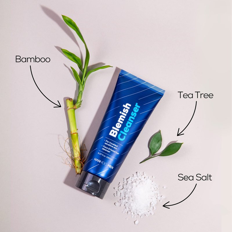 HANHOO Men Blemish Cleanser | Daily Facial Cleanser | Beard and Face Wash with Tea Tree Oil, Probiotics, & Hyaluronic Acid | Soothes Acne-Prone Skin | For All Skin Types | 5.07 fl oz
