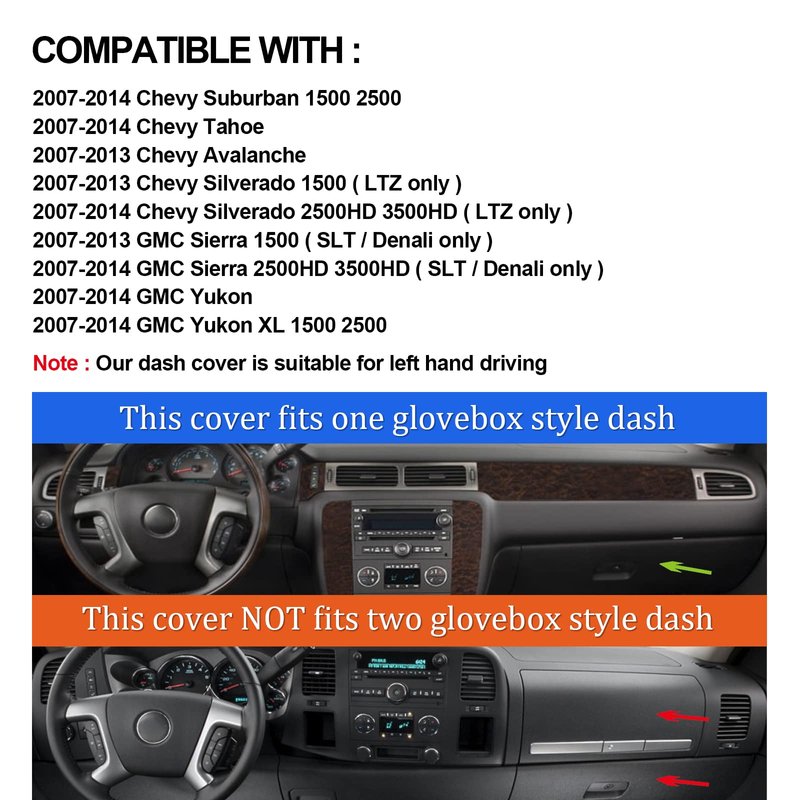 - ☁FITMENT-dash cover For Chevy Tahoe Avalanche Suburban 2007-2014 ; For GMC Yukon/XL/Denali 2007-2014 ; For Chevy Silverado 2007-2013 (LTZ ONLY) ;For GMC Sierra (SLT/Denali ONLY) 2007-2013