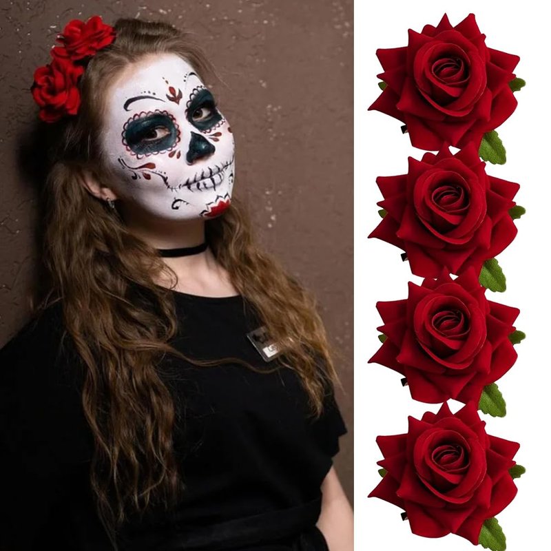 HANSAMU Rose Floral Pin up for Halloween Costume Decoration, Mexican Fabric Rose Flowers Brooch Hair Clip Headpieces for Woman Girl Day of the Dead (4 Pcs)