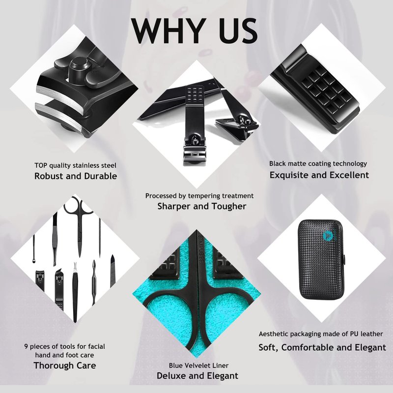 Our manicure set are made of high quality stainless steel/carbon steel tools, elegant and high quality leather, PU, fabric etc. All tools are polished, ground for sufficient times and elaborately treated to function well, comfortable,reliable and durable.