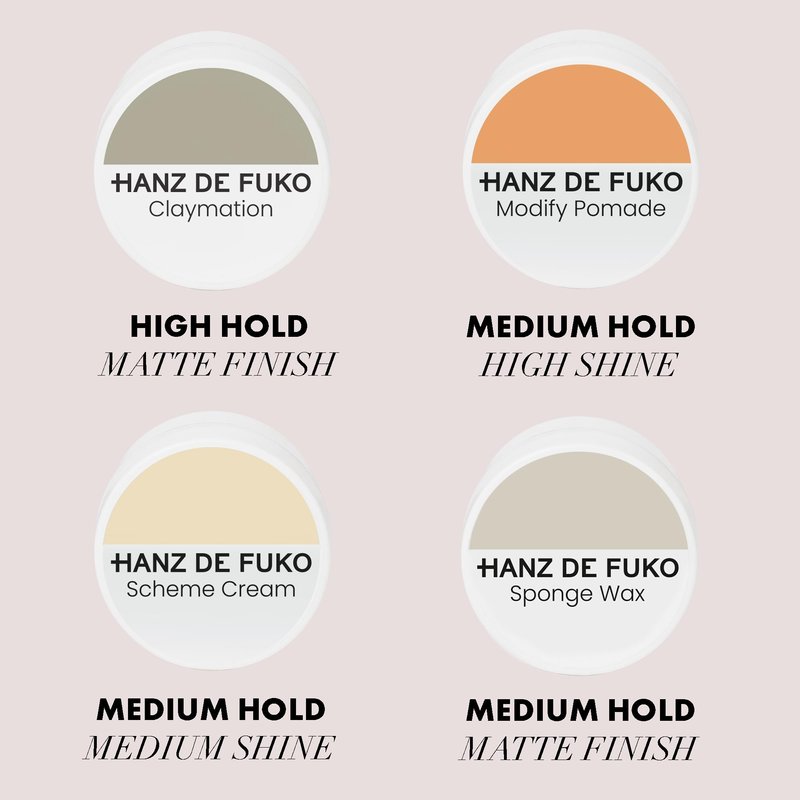 - Color: Hanz de Fuko Deluxe Hair Care Kit – Super Styling Sampler Featuring Claymation, Sponge Wax, Modify Pomade, Scheme Cream – Certified Organic Ingredients, 4 pack, 0.25oz each