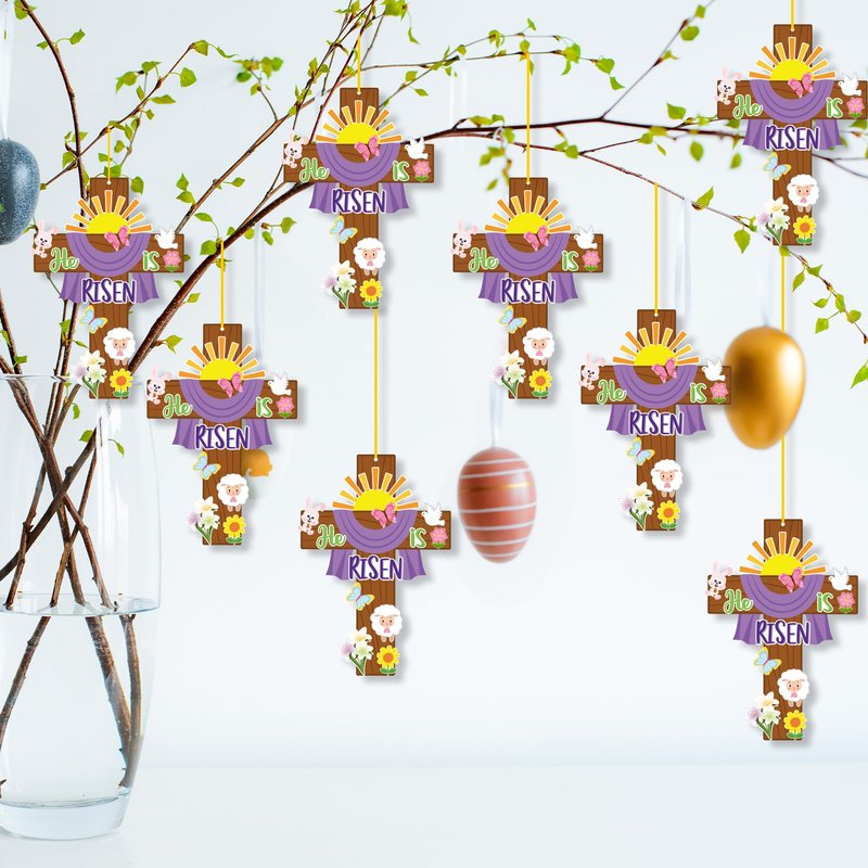 Haooryx 28 Pack Easter He is Risen Cross Craft Kit, Make Your Own Jesus Resurrection Cross Hanging Ornaments Thankful Craft for Church Sunday School Classroom Christian Easter Day Party Supply