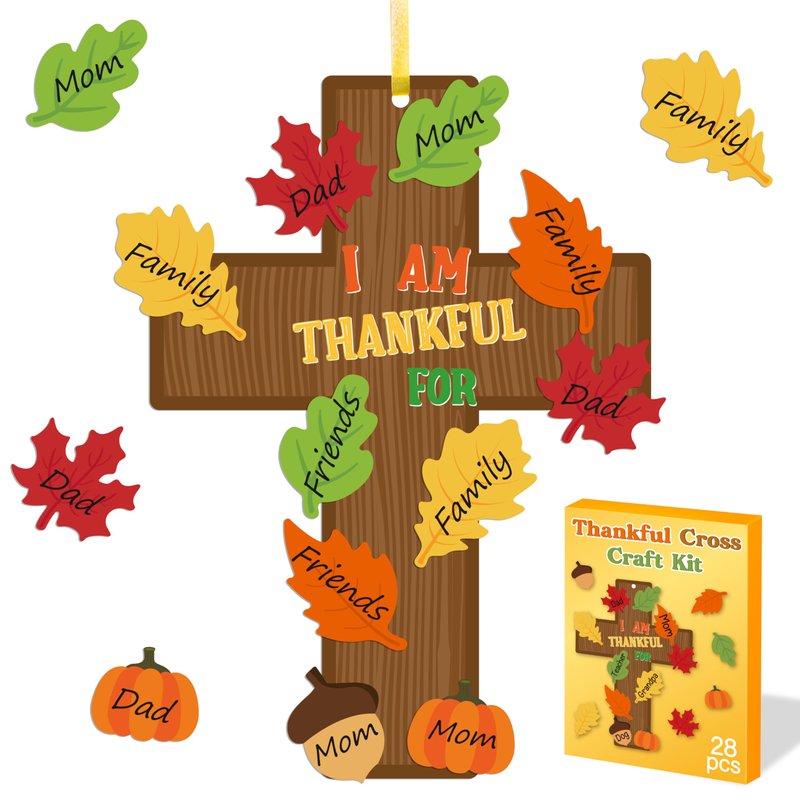 Haooryx 28 Pack Fall Christian Cross Craft Kit Make Your Own Religious Thanksgiving Thankful Cross Hanging Ornament DIY Thankful Craft Religious Classroom Sunday School Church Give Thanks Party Decor