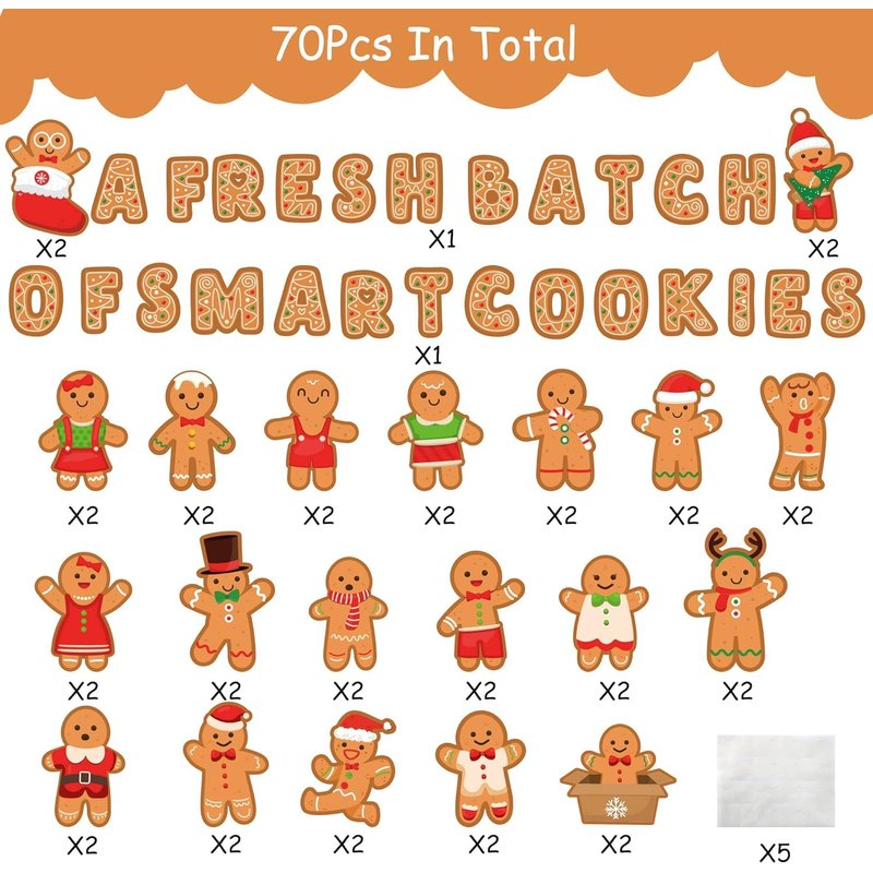 - Value Package: You will get 70pcs Christmas gingerbread bulletin board, including 40pcs gingerbread man cards in 20 different designs, 25pcs "A FRESH BATCH OF SMART COOKIES" letter cards and 5 sheet glue sheet. Enough quantities to meet your Christmas classroom decorating need.