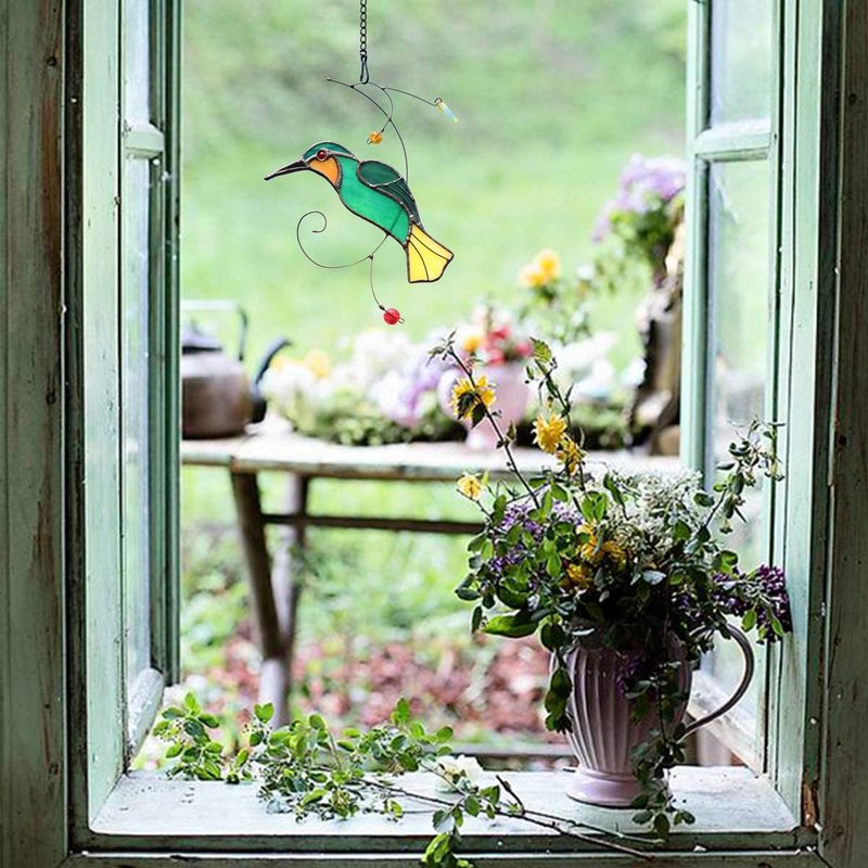 HAOSUM Hummingbird Stained Glass Window Hangings Suncatcher Gift for Mom Stained Glass Bird Garden Patio Decor (6.3"×4.7”)