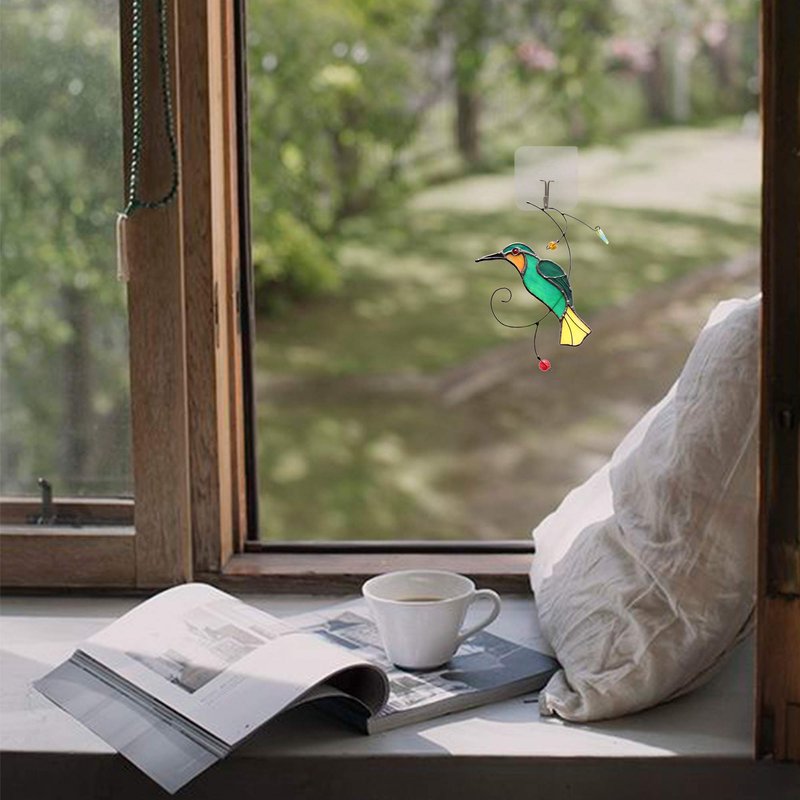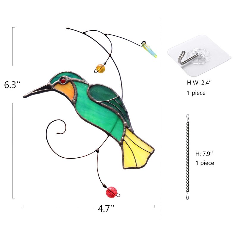 Hummingbird Material: stained glass, copper foil, strong metal chains and suction cup for easy hanging .