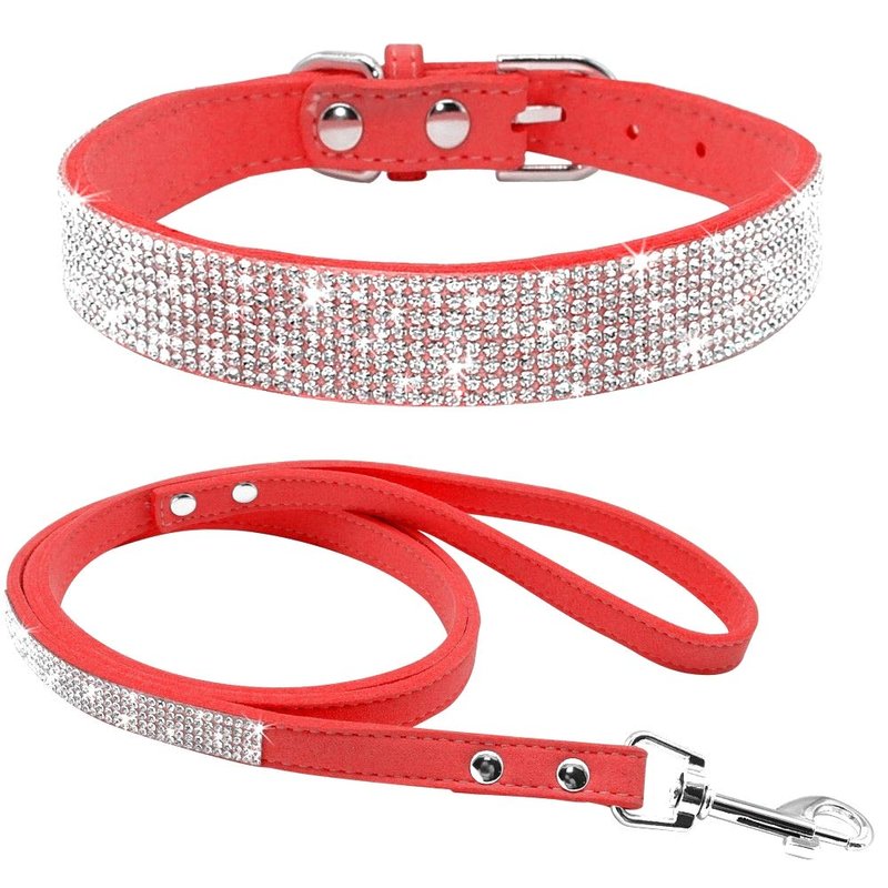 Haoyueer Cute Dazzling Sparkling Elegant Fancy Soft Suede Leather Bling Rhinestone Crystal Jeweled Pet Cat Dog Puppy Collar Dog Leash Combo Set(Red,XXS)