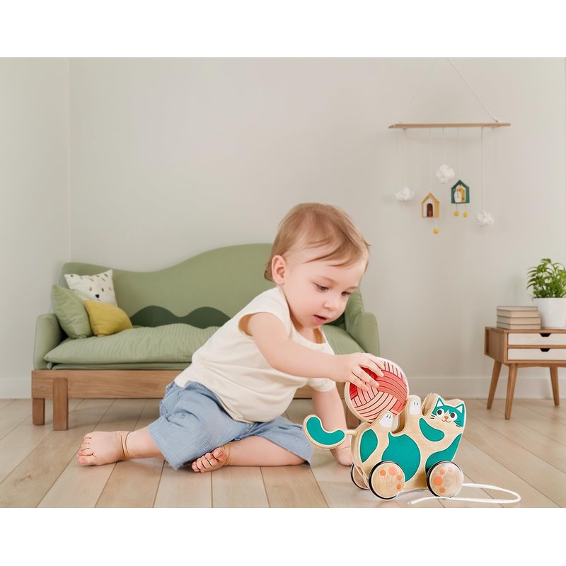 Hape Wooden Walk-A-Long Kitten Pull Toy| Roll & Rattle Push Pull Toy for Toddler| Montessori Toys for Walking Toddlers, Green