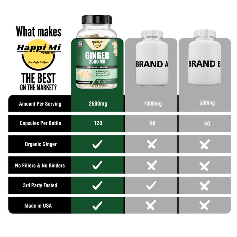 - Happi Mi Nutrition’s Ginger capsules offers nothing but fresh organic ginger powder. Our bottle comes in 120 vegetarian capsules for 40 days supply.