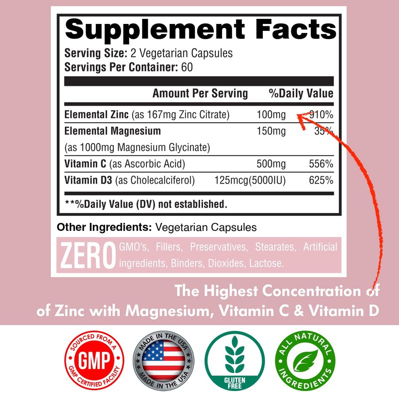 - Vitamin C with Zinc: Happi Mi Zinc offers 100mg Elemental Zinc of Zinc Citrate , 500mg of Vitamin C as Ascorbic Acid, 5000 IU (125mcg) of Vitamin D and 150mg of elemental Magnesium per Serving for 60 Day Supply. Vitamin C and Zinc are known for boosting the immune system for adults, immunity support for women and men, skin health, and cardiovascular health.