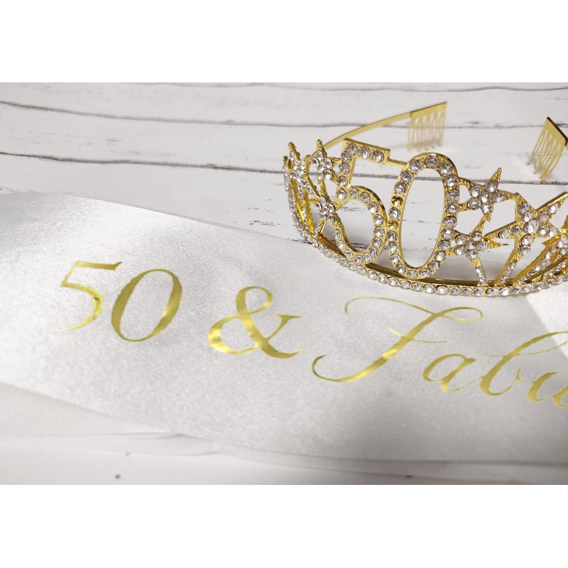 • THE 50th BIRTHDAY KIT INCLUDES - 50th rhinestone crown and glitter " 50 & Fabulous" birthday sash. It is a wonderful set for girl's 50th party and the crown can still be worn for long after the cake is eaten.