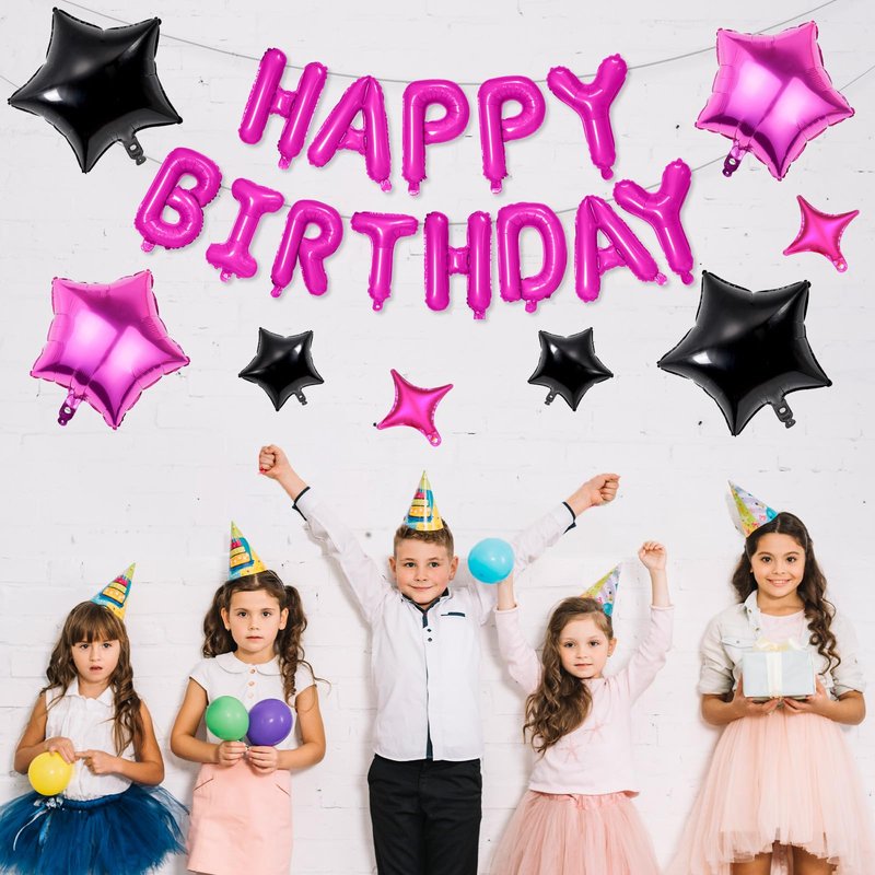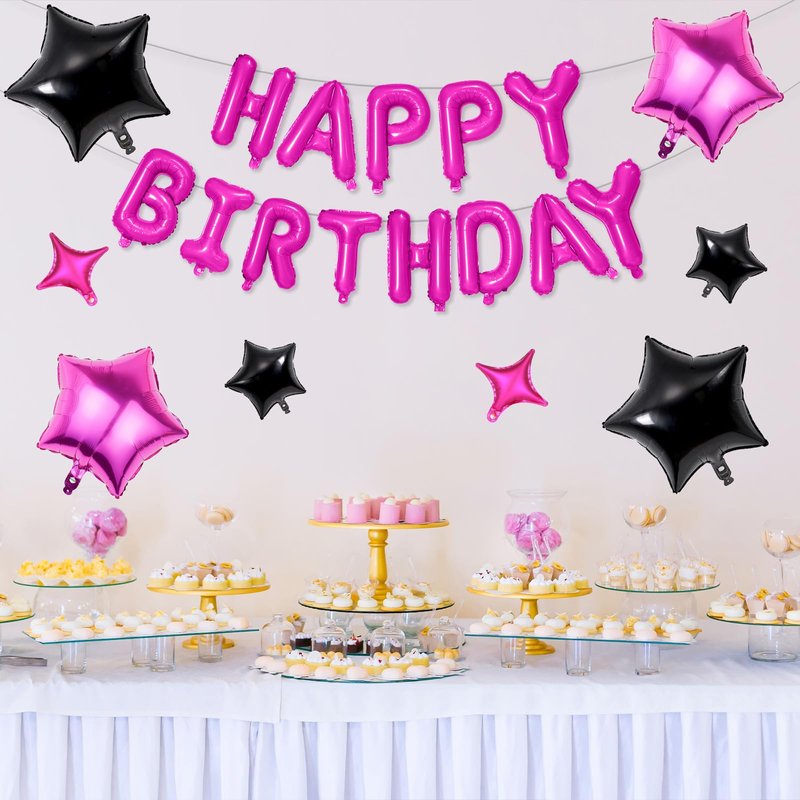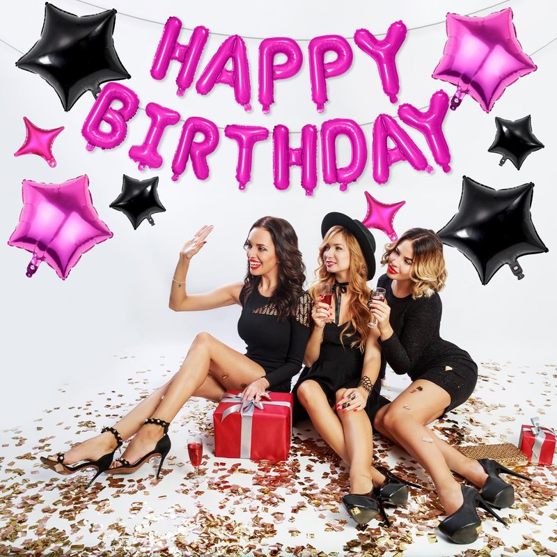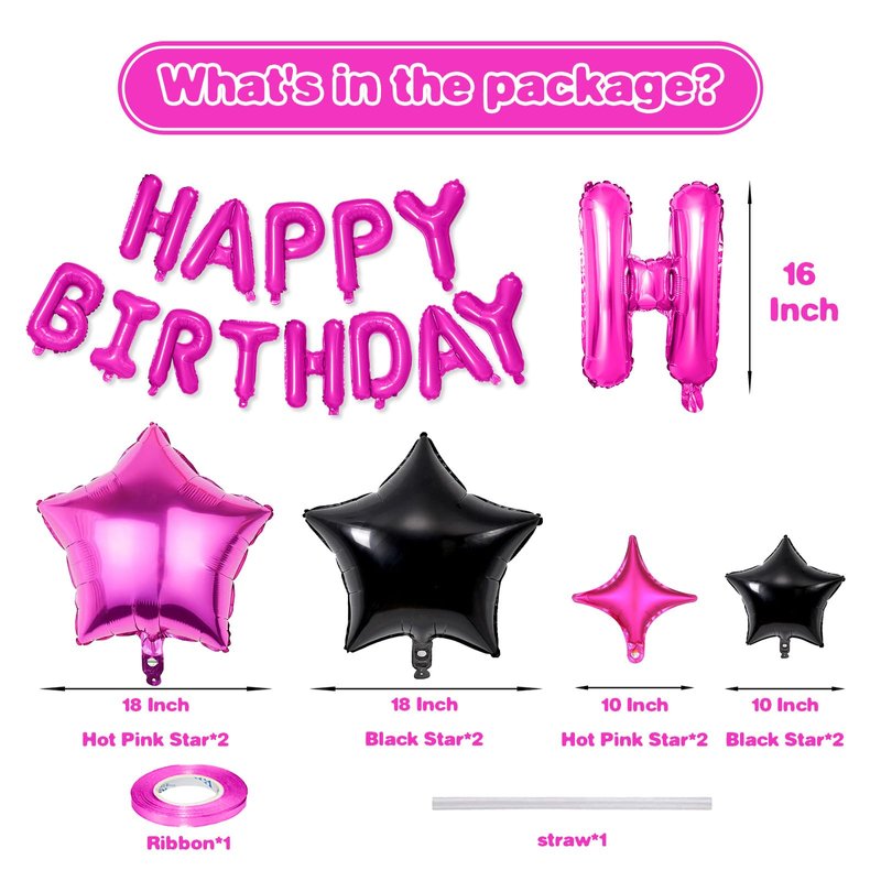 - Package Includes: Our black and hot pink happy birthday balloons set come with ①Hot pink HAPPY BIRTHDAY letters x13pcs (16 inch) ②Hot pink five-pointed star x2pcs (18 inch) ③Black five-pointed star x2pcs (18 inch) ④Black five-pointed star x2pcs (10 inch) ⑤Hot pink four-pointed star x2pcs (10 inch) ⑥Hot pink Ribbon x1roll (32 feet) ⑦Plastic straw x1pc.