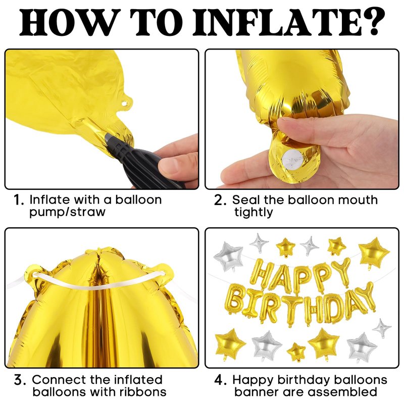 - Easy to Assemble: Easy to inflate and assemble. You can inflate the balloons with balloon pump/straw. Just tape it or use the ribbon to hang the happy birthday banner on the wall, window, balloons arch, party decoration background etc.