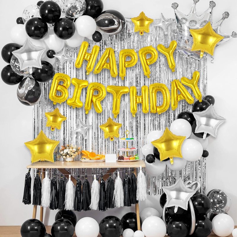 Package Includes: 1 set happy birthday balloons, 3 pcs 10inches four-pointed star balloons, 3 pcs 10inches five-pointed star balloons, 6pcs 18inches five-pointed star balloons, 1pcs straw, 1pcs ribbon.