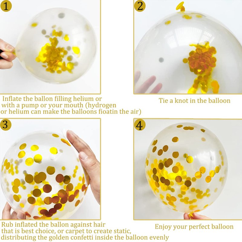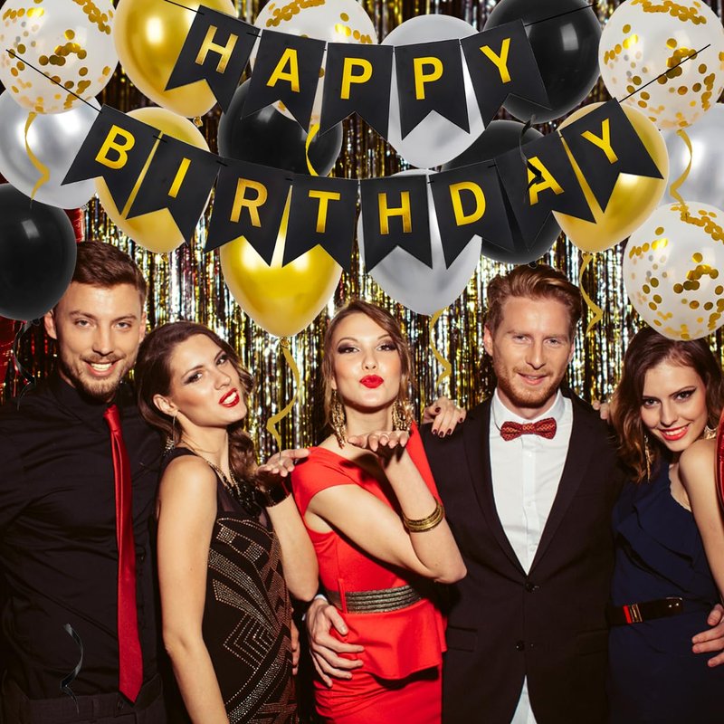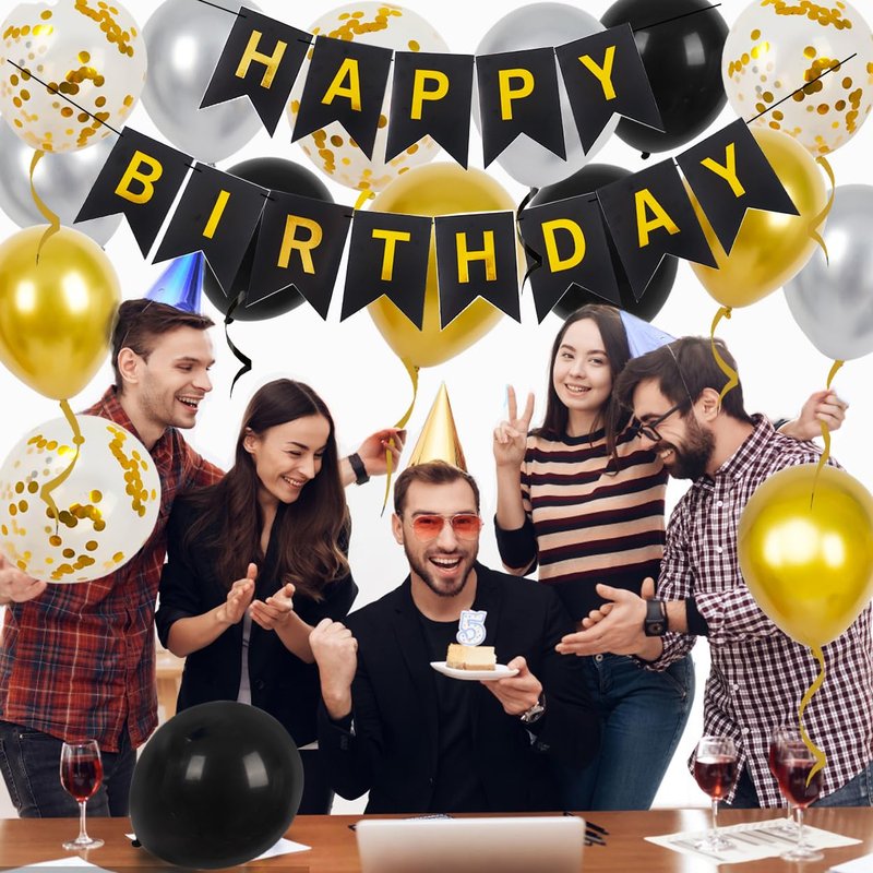 - Birthday Decorations Set: Black happy birthday banner + 4 x 12 inch black latex balloons + 4 x 12 inch gold confetti latex balloons + 4 x 12 inch gold metallic balloons + 4 x 12 inch silver metallic balloons + 2 rolls of ribbon, the perfect birthday decorations to bring you a unique and wonderful party.