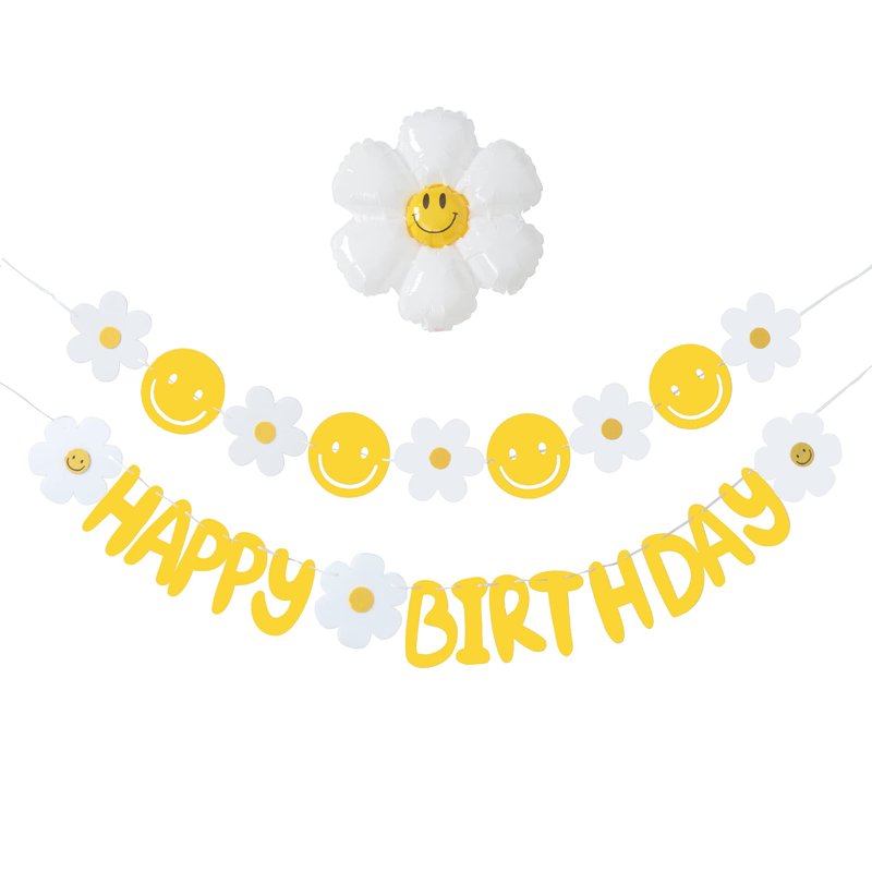 Happy Birthday Banner, Daisy Birthday Party Decorations with Daisy Balloon and Felt Daisy Smiley Face Birthday Banners for Boho Hippie Groovy Smiley Face Party Baby Shower Girl Birthday Decorations