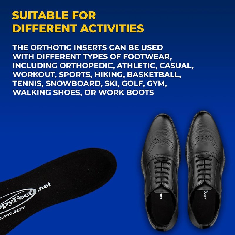 - ANY AGE & ACTIVITY: Happy Feet Fluid Orthotics for Men Women Big Kids - Work, Running, Long Standing, Gym, Hiking. Top Inserts for office shoes, working boots. Our Boot Inserts provide Great shock Absorption because of Inserted Gel Forefoot and top quality cushioning. Our Built-in heels support keeps your foot bone vertical and balances to provide stability.