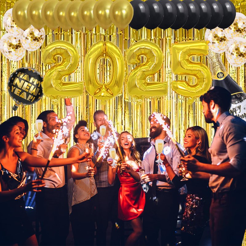 - 【2025 NYE Party Decorations】 This comprehensive New Year's Eve party decoration set includes everything you need to create a festive atmosphere, including New Year's hats, a banner, 30 12-inch balloons (10 golden, 10 black, 10 confetti), 1 New Year's 2025 balloon, 2 matte gold foil fringe curtains, 8 New Year's Eve glasses, and 3 foil balloons. It is an innovative and versatile decorative suite that will be the perfect choice for your New Year's Eve celebration.