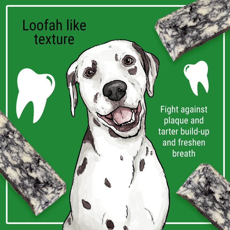 - GREAT TASTING CHARCOAL DENTAL CHEW with loofah like texture. Special formula means Happy Teeth scrape your pup's teeth with every crunchy bite and chew. Activated charcoal inhibits bacterial plaque buildup, adds extra cleaning power, freshens breath, and whitens teeth
