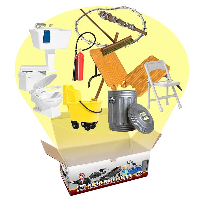 - This set includes a variety of hardcore accessories to create intense and dramatic segments, featuring a toilet, sink, mop, broom, trash can, folding chair, breakable table, fire extinguisher, push broom, barbed wire, and a barbed wire bat.