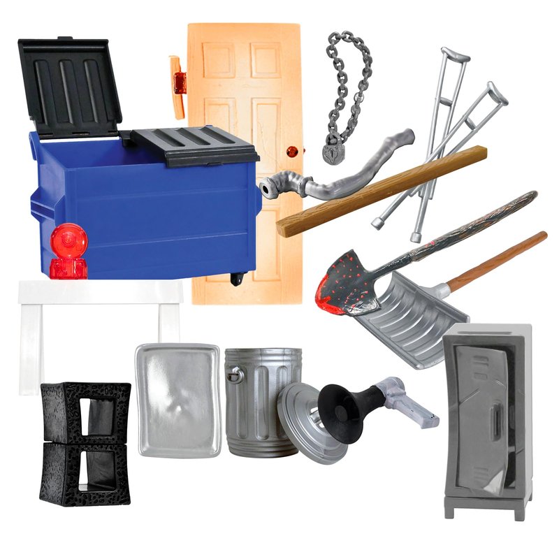 Intensify your wrestling action figure battles with the Hardcore Dumpster 15 Piece Accessory Set. This set features a Blue Dumpster and a wide array of hardcore accessories, including a hardcore door, trash can, pipe, snow shovel, tray with a smashed face, a set of crutches, a 2x4 wooden board, road barricade, megaphone, locker, concrete block, lock and chain, and a bloody shovel. Perfect for creating extreme matches and gritty backstage brawls, these accessories add realism and excitement to your wrestling figure setups. Whether it’s a brutal street fight or a hardcore title match, this set has everything you need to take your action figure collection to the next level! Compatible with all wrestling action figures. Also a good scale for other 6-8 inch action figures.