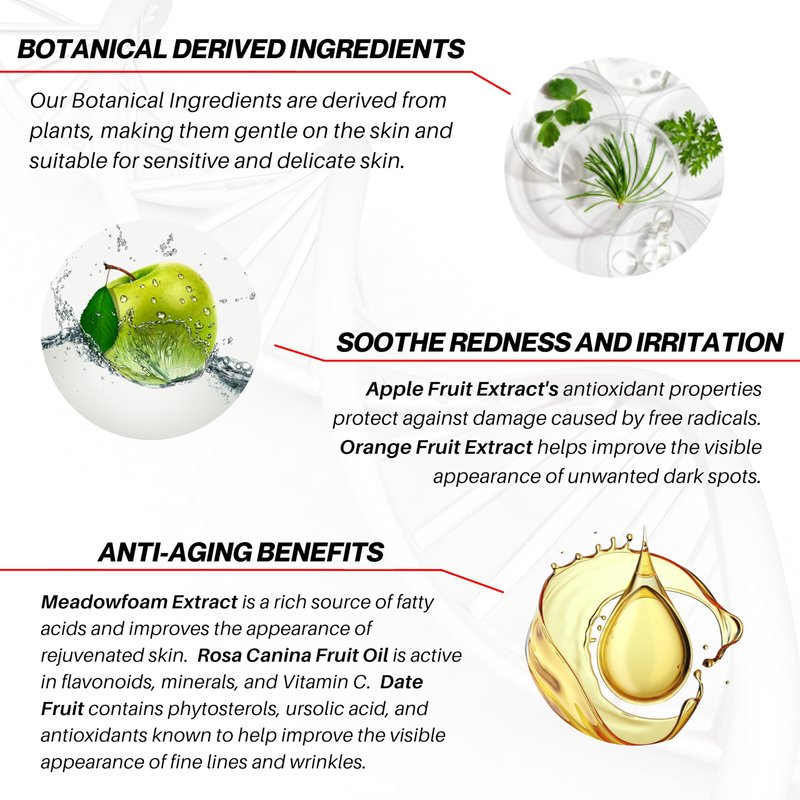 - [ BOTANICAL DERIVED ANTIOXIDANTS ] The profound importance of gentle yet potent antioxidants in repairing skin damage caused by environmental stressors, including sun exposure and harsh weather conditions, cannot be overstated. Post-sun exposure, topical antioxidants become imperative to mitigate the adverse impact of UV radiation and other environmental stressors.