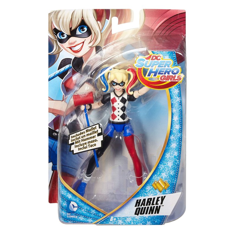- Harley Quinn action figure is ready to save the day in her signature outfit (non-removable) that blends iconic elements of the original DC Super Hero character -black, red and blue; a diamond-shaped Harlequin-inspired print; mismatched fashion; and large mallet -with modern trends.