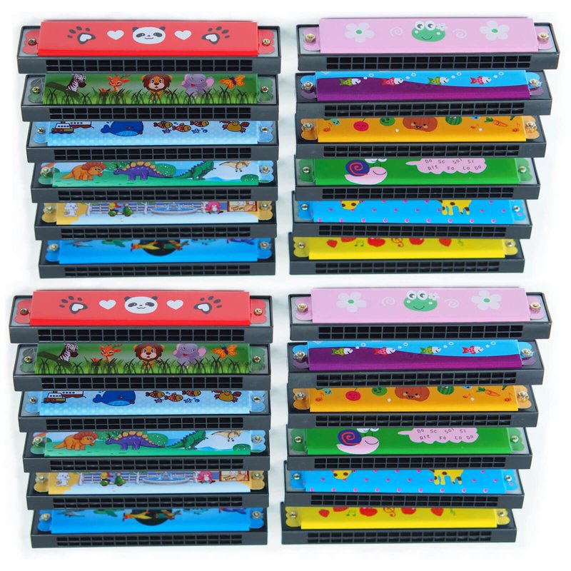 - PACK OF 24 - This Kids harmonicas set of 24 comes in multi-patterns individually packaged and fun for children of all ages 3+ and up. These cute harmonicas are printed with different exquisite cartoon patterns including dinosaurs, animals, insects, etc.. Random Patterns Sent. Colors and patterns will vary or repeat. We can not guarantee exactly which patterns will be shipped and may be different than colors pictured.
