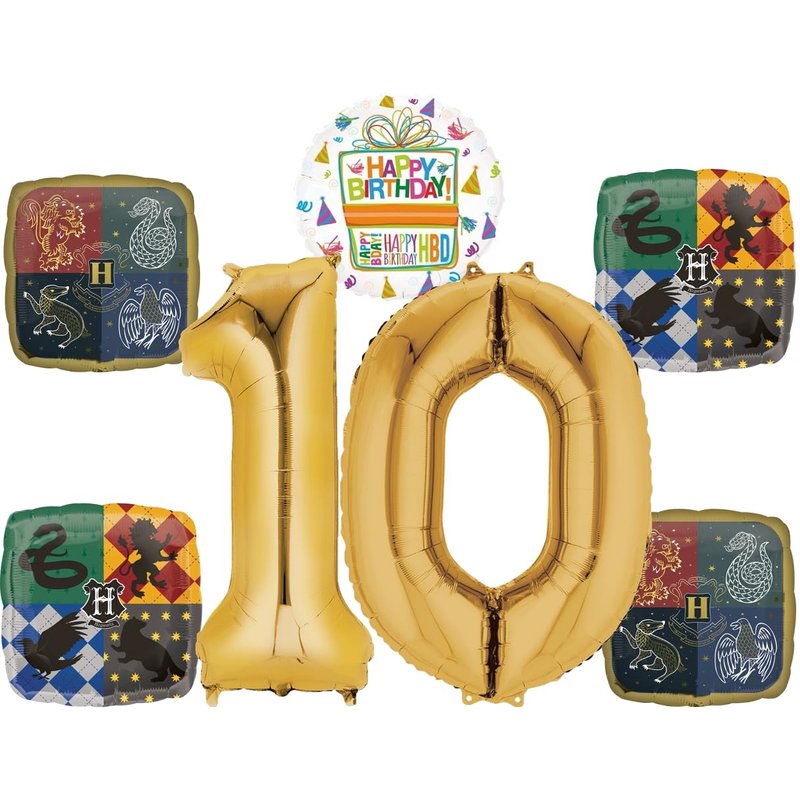 - (1) 34" Giant Gold Number 1 Foil Balloon, (1) 34" Giant Gold Number 0 Foil Balloon, (4) 17" Square Harry Potter Foil Balloons and (1) 18" Mayflower Products Happy Birthday Present Foil Balloon. Inflate balloons same day of event. Ribbon Not Included. All Anagram Licensed Foil Balloons are Made in USA. Founded in 1977, Anagram International leads the world in innovating and manufacturing foil balloons.