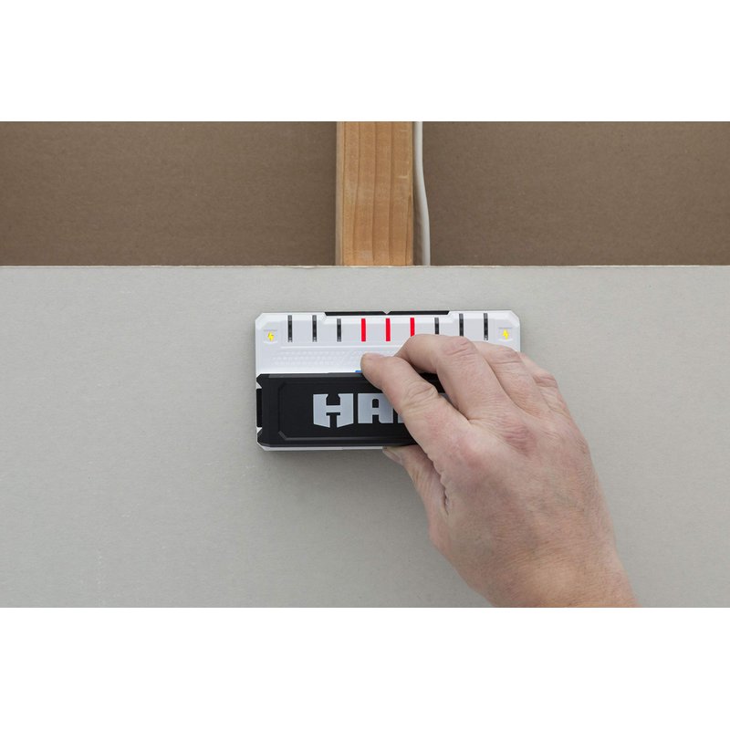 The HART9PRO is the perfect marriage of easy, accuracy and sturdiness. The HART9PRO is a simplified design that can withstand the rigors of construction site or a weekend DIY project. It has a max detection depth of 1.5" and features a 5" extra-wide LED display to instantly show the center and edge of studs. The Stud Finder runs on AAA batteries.