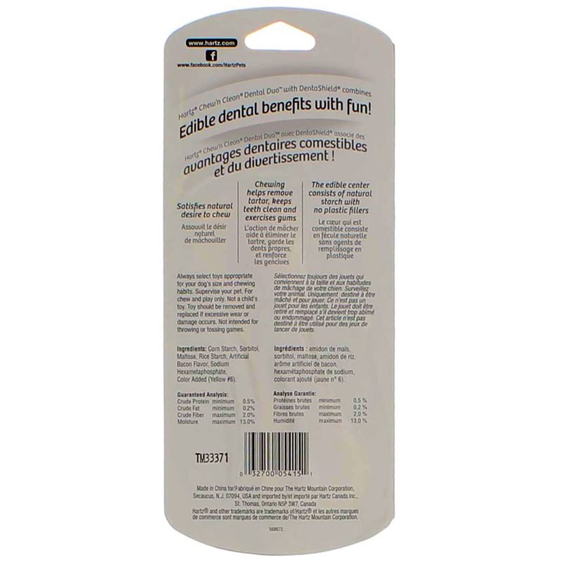 Hartz Chew 'n Clean Dental Duo is a long-lasting chew toy and treat all in one! It's constructed from durable materials that withstand mild to moderate chewing. Enriched with a delicious, edible bacon flavored center and our DentaShield technology, the Dental Duo reduces new tartar formation by bonding with components in your dog’s saliva. The chewing action helps reduce tartar build-up, freshen breath and promote healthy gums.