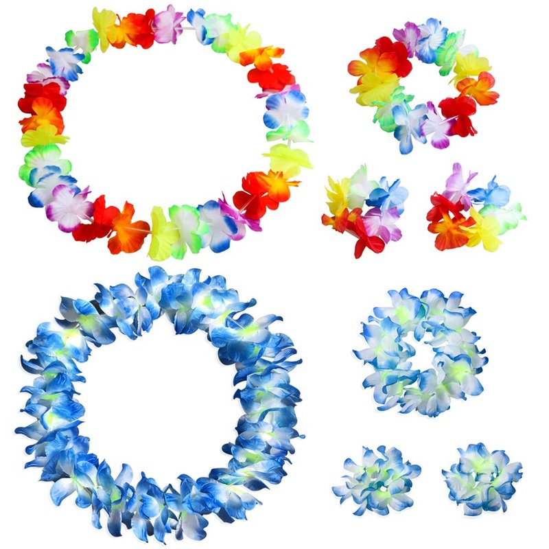 - 【HIGH QUALITY】 Excellent handmade soft materials and exquisite workmanship, hand-crafted carefully down to every detail to give a stunning, magical, sexy, lovely chic look. It is made of high quality eco-friendly smooth shiny plastic, package: 2 pack headband + 2 pack leis necklace + 4 pack braceklets, approximately circumference for necklace is 41.3", for headband is 16.5", for bracelet is 7.9". What are you still waiting for? just add it to your cart and enjoy it with your friends and family