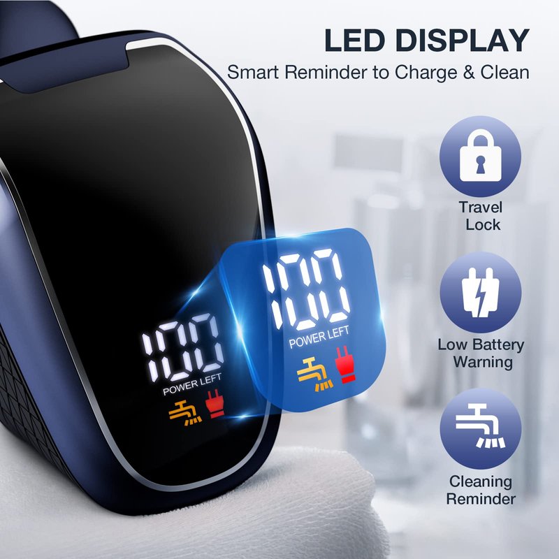 - 【LED Intelligent Display】The bald head shaver for men with LED display can accurately show the percentage of the battery power. Low battery reminder, water washing reminder more intelligent. Long press the switch button for 3 seconds to trigger the travel lock to avoid additional power consumption. This electric shaver uses 600mAh large-capacity battery, 2 hours of fast charging can provide 60 minutes of working time. Please charge it in time for regular use.
