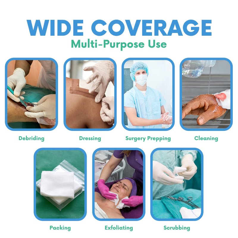- MULTI-PURPOSE WOUND DRESSING - Its 2x2-inch size offers good coverage and several different applications. This is ideal for general wound cleaning, dressing, debriding, prepping, and packing wounds. It is also perfect as a temporary or first-aid dressing for fresh wounds.