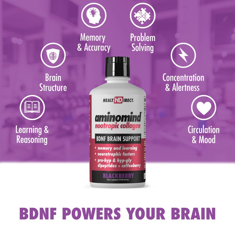 Discover the Next-Level Brain Health with AminoMind Nootropic Collagen Elevate your cognitive wellness w Health Direct's AminoMind, a groundbreaking supplement blending nootropic and collagen benefits. It's meticulously crafted for those seeking to boost their brain function, mental agility, and overall cognitive health. Unlock Your Cognitive Potential AminoMind leverages the synergistic power of nootropic agents and collagen dipeptides to enhance brain function. By boosting BDNF, it plays a pivotal role in nurturing neuron health and synaptic plasticity, essential for learning, memory, and cognitive agility. Mood and Cognitive Function Synergy Our unique formula is more than just a brain booster; it's a holistic approach to cognitive wellness. L-Tryptophan promotes serene, balanced moods, while L-Citrulline ensures robust cerebral circulation. Together, they create an environment conducive to optimal mental performance. A Commitment to Purity and Quality At Health Direct, we're dedicated to providing you with supplements that not only meet but exceed quality standards. AminoMind is a testament to this commitment, offering a clean, effective, and allergen-free option for enhancing brain health. Incorporate AminoMind into your daily routine and experience the transformative benefits of this nootropic collagen supplement for your cognitive health and wellness.