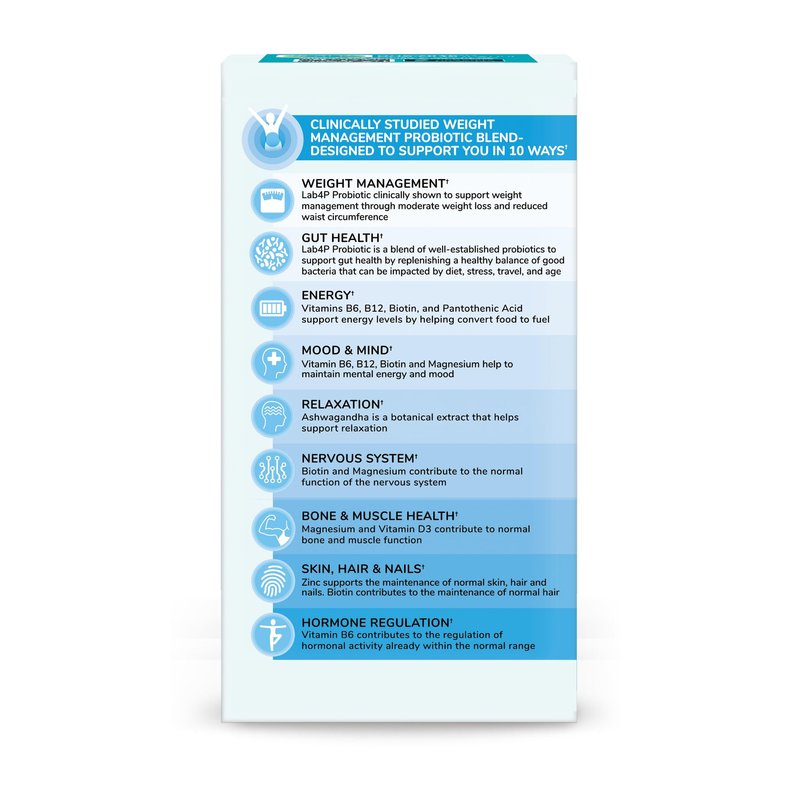 At Health & Her, we are passionate about women's health. That’s why we have conducted extensive research with thousands of women to understand how to best support wellbeing during periods of hormonal change. Clincally studied, Health & Her Weight Management Probiotic is a blend of 50 billion live cultures, vitamins, minerals and a botanical extract, and provides women with a convenient source of vitamin B6, which contributes to the regulation of hormone activity. Managing your weight can become challenging with symptoms of menopause, and as you age, your metabolism starts to decrease and your body starts to change. Our clincally studied weight management probiotic blend - Designed to support you in 10 ways: WEIGHT MANAGEMENT Lab4P Probiotic clincally shown to support weight management through moderate weight loss and reduced waist circumference GUT HEALTH Lab4P Probiotic is a blend of well-established probiotics to support gut health by replenishing a healthy balance of good bacteria that can be impacted by diet, stress, travel, and age ENERGY Vitamins B6, B12, Biotin and Pathothenic Acid support energy levels by helping convert food to fuel MOOD & MIND Vitamins B6 & B12, Biotin and Magnesium help to maintain mental energy and mood RELAXATION Ashwagandha is a botanical extract that helps support relaxation NERVOUS SYSTEM Biotin and Magnesium contribute to the normal function of the nervous system BLOOD SUGAR LEVELS Chromium contributes to the maintenance of healthly blood sugar levels already within the normal range BONE & MUSCLES HEALTH Magnesium and Vitamin D3 contribute to normal bone and muscle function SKIN, HAIR & NAILS Zinc supports the maintenance of normal skin, hair and nails. Biotin contributes to the maintenance of normal hair HORMONE REGULATION Vitamin B6 contributes to the regulation of hormonal activity already within the normal range. These statements have not been evaluated by the Food and Drug Administration. This product is not intended to diagnose, treat, cure, or prevent any disease. WARNINGS: Keep out of sight and reach of children. Do not exceed the recommended intake. Consult your physician prior to using this product if you are pregnant, nursing, taking medication, or have a medical condition. Discontinue use two weeks prior to surgery. Store in a cool dry place. Best before end: see base of pack.
