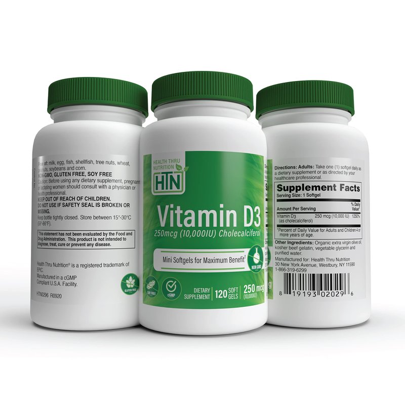 Health Thru Nutrition Vitamin D3 10,000 IU Non GMO 120 Mini Softgels (10000 iu cholecalciferol) Soy Free, USP Grade Natural Vitamin D