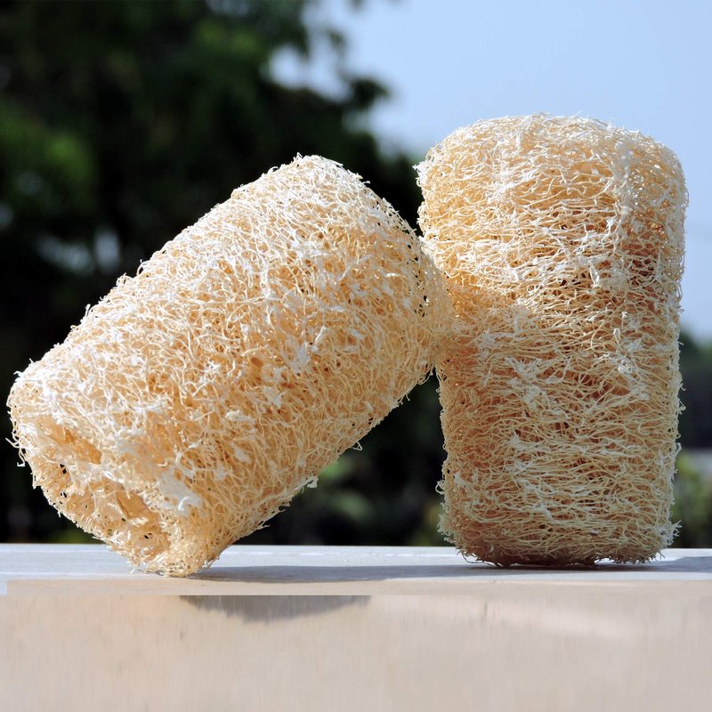 - Set of two natural loofah sponges. These sponges are derived naturally from dried fibrous interior of gourds.
