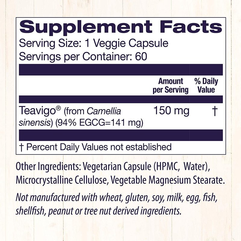 - Pure EGCG: 150 mg of 94% EGCG per capsule supports antioxidant activity in the body; this supplement is free of herbicides, pesticides, and caffeine