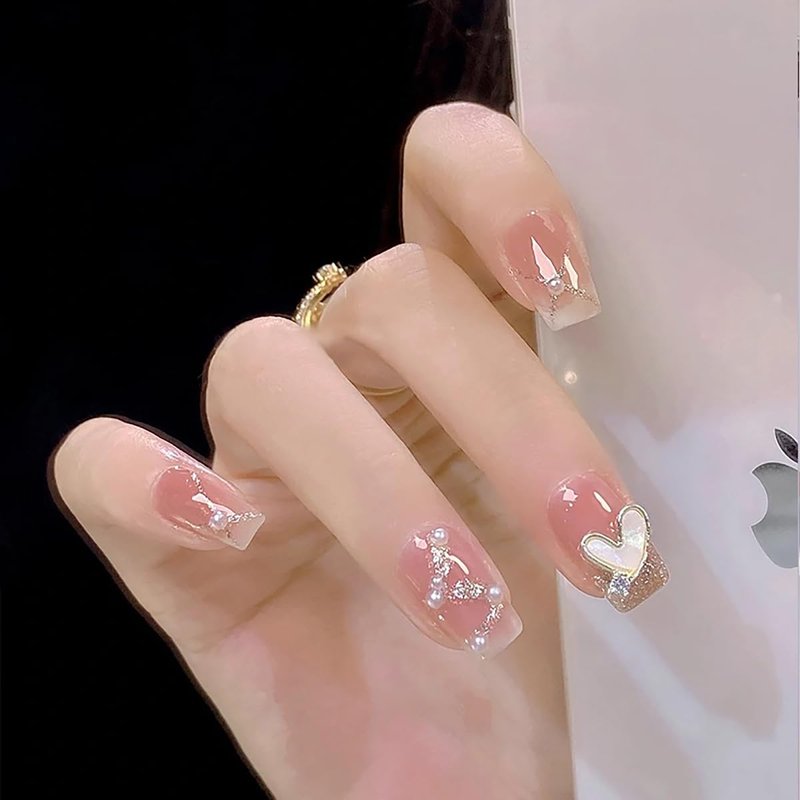 Heart Charm Press on Nails Short Coffin Nails Reusable Nude Fake Nails with Pearl Diamond False Nails with Glossy Glue on Nails Full Cover Glitter Acrylic Nails for Women Girls 24 Pcs