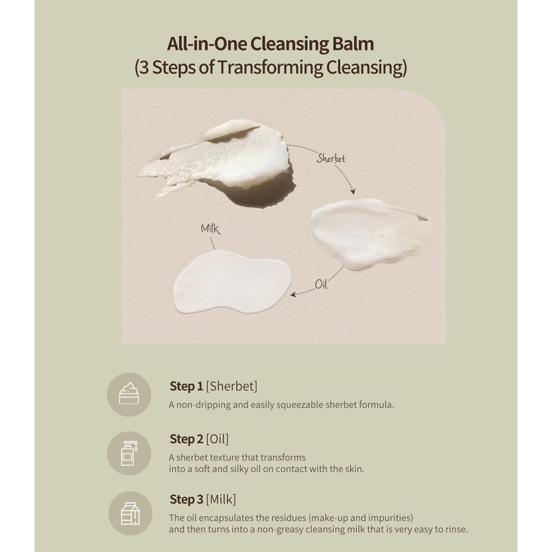 - [All-in-One] A sherbet texture that transforms into a soft and silky oil on contact with the skin and then emulsifies into a velvety milk on contact with water. The oil encapsulates the residues (make-up and impurities) and then turns into a non-greasy cleansing milk that is very easy to rinse. Your skin is deeply cleansed as well as soft and supple with this one-step all-in-one cleansing balm. These 3 steps of transforming cleansing (sherbet-oil-milk) is perfect for a daily facial cleanser.