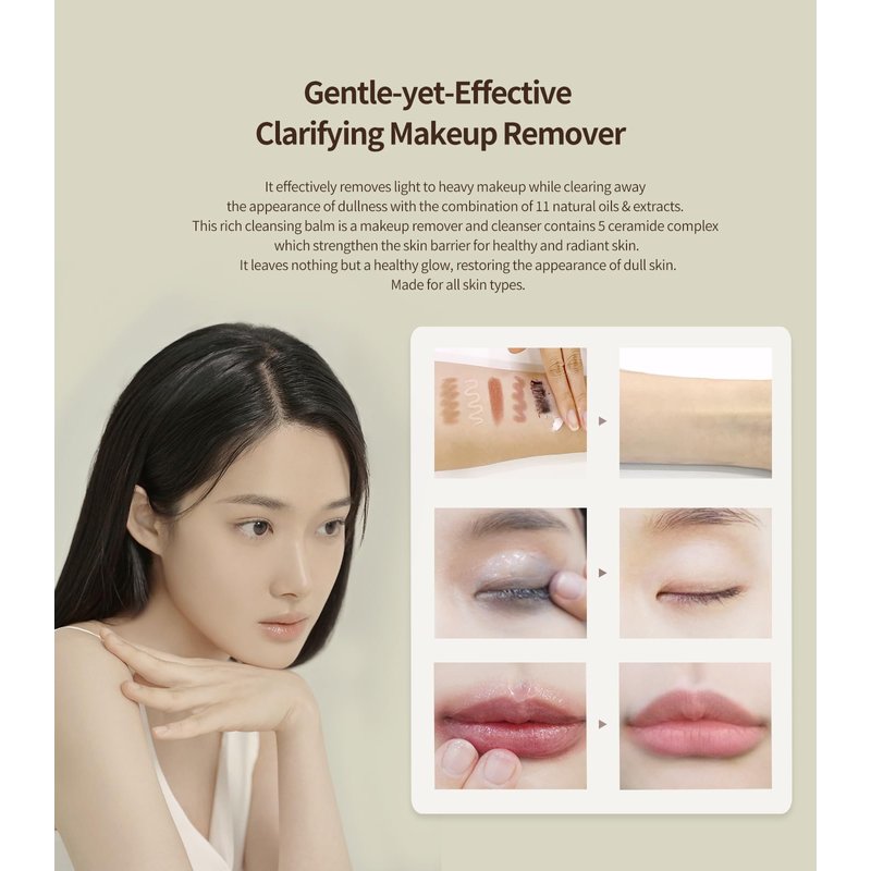 - [Gentle-yet-Effective Clarifying Makeup Remover] It effectively removes light to heavy makeup while clearing away the appearance of dullness with the combination of 11 natural oils & extracts. This rich cleansing balm is a makeup remover and cleanser contains 5 ceramide complex which strengthen the skin barrier for healthy and radiant skin. It leaves nothing but a healthy glow, restoring the appearance of dull skin. Made for all skin types.