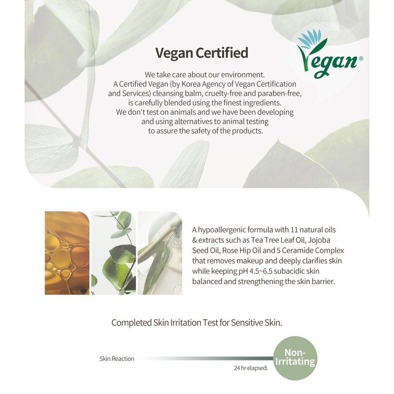- [Vegan Certified / Hypoallergenic with Natural Ingredients] Absolutely Vegan Certified by Korea Agency of Vegan Certification and Services. A hypoallergenic formula with 11 natural oils & extracts such as Tea Tree Leaf Oil, Jojoba Seed Oil, Rose Hip Oil and 5 Ceramide Complex that removes makeup and deeply clarifies skin while keeping pH 4.5~6.5 subacidic skin balanced and strengthening the skin barrier.