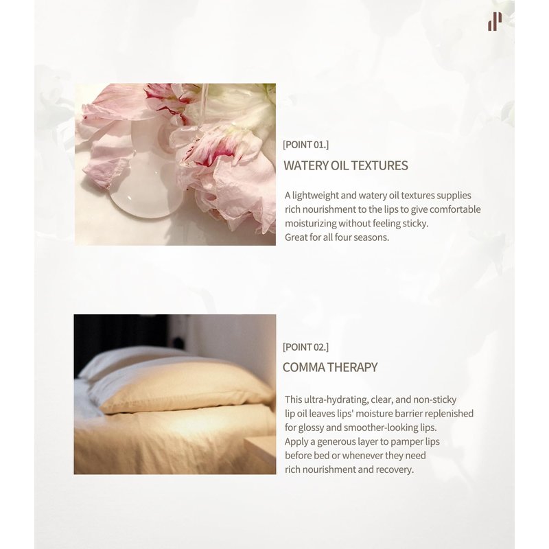 - [Comma Therapy] This ultra-hydrating, clear, and non-sticky lip oil leaves lips' moisture barrier replenished for glossy and smoother-looking lips. Apply a generous layer to pamper lips before bed or whenever they need rich nourishment and recovery. Wear alone, as a treatment before lip color or as a lip topper. Can be used daily.
