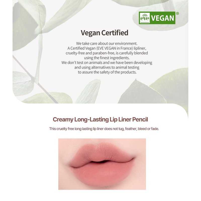 - [Vegan Certified] We take care about our environment. A Certified Vegan (EVE VEGAN in France) lipliner, cruelty-free and paraben-free, is carefully blended using the finest ingredients. We don't test on animals and we have been developing and using alternatives to animal testing to assure the safety of the products.