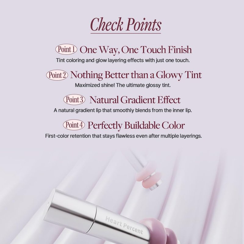 - [Nothing Better than a Glowy Tint] Maximized shine! The ultimate glossy tint. Heart Percent's HIPDEWY Formula, which maximizes tint shine is the ultimate gloss tint that layers high-gloss glow to perfection!